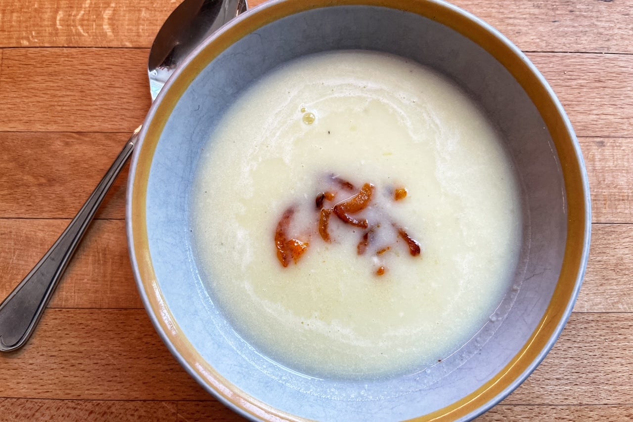 Test potatoe bits: They should start to fall apart. Remove pot from heat. Carefully (hot!!) blend everything, including the liquid (I use an immersion blender, but you can also pour the ingredients in a stand-up blender and then return to the pot).